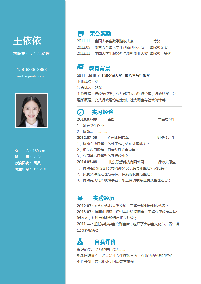 产品助理蓝色个人简历模板下载 声明:本站所有模板均为:word格式简历模板,遇到问题联系客服微信:ivx168 ;【付费模板购买后F5刷新一下】产品助理 收藏 海报 分享链接:https://www.mubanjianli.com/1090.html 分享到 :