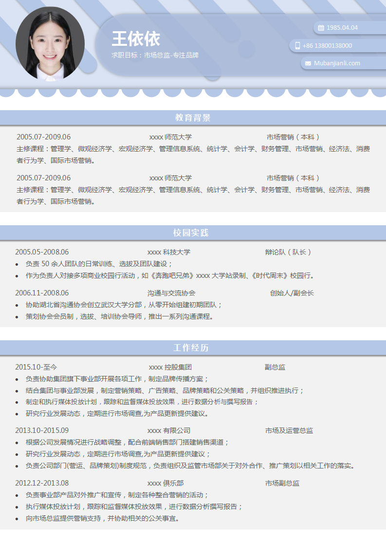 通用个人求职简历模板下载 声明:本站所有模板均为:word格式简历模板,遇到问题联系客服微信:ivx168 ;【付费模板购买后F5刷新一下】两页简历 收藏 海报 分享链接:https://www.mubanjianli.com/1216.html 分享到 :