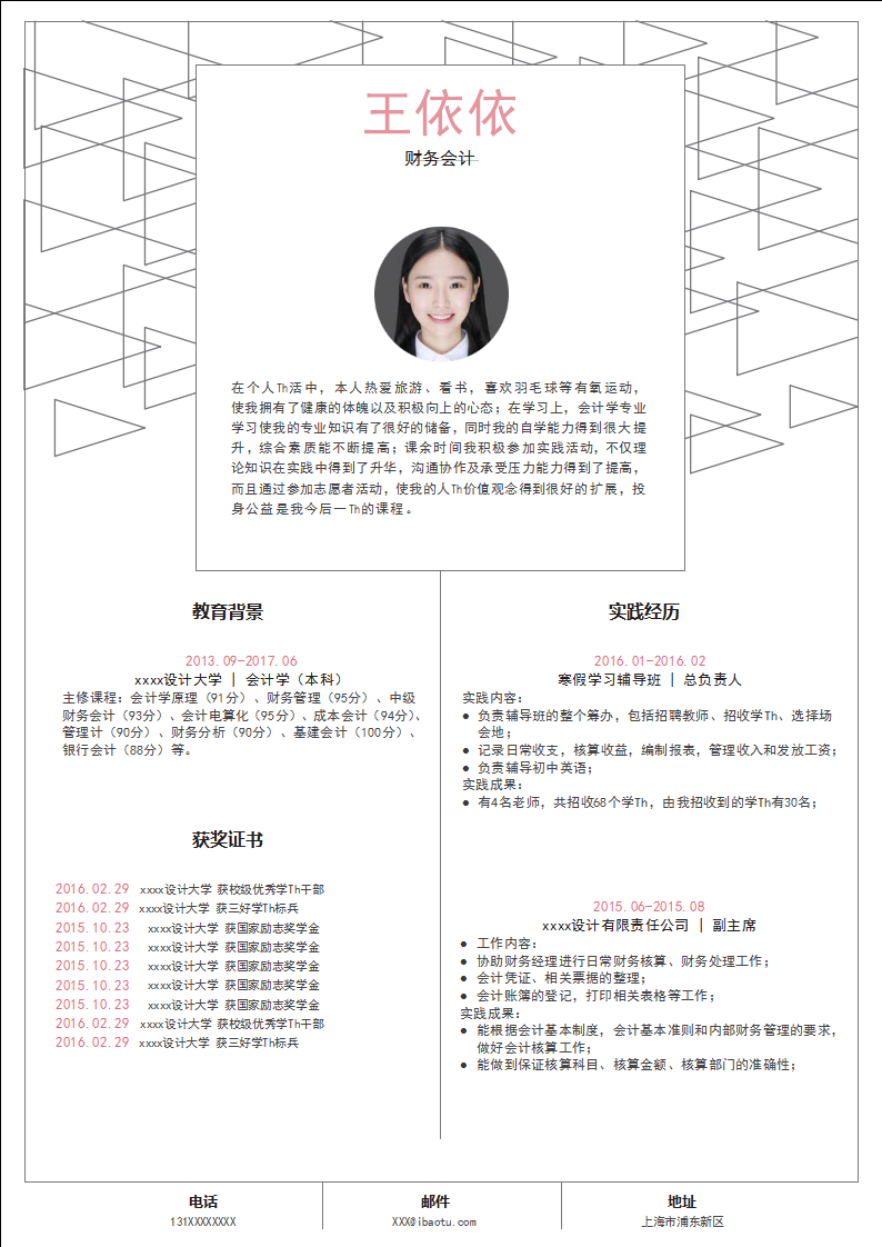 会计求职简历模板下载 声明:本站所有模板均为:word格式简历模板,遇到问题联系客服微信:ivx168 ;【付费模板购买后F5刷新一下】 收藏 海报 分享链接:https://www.mubanjianli.com/1479.html 分享到 :