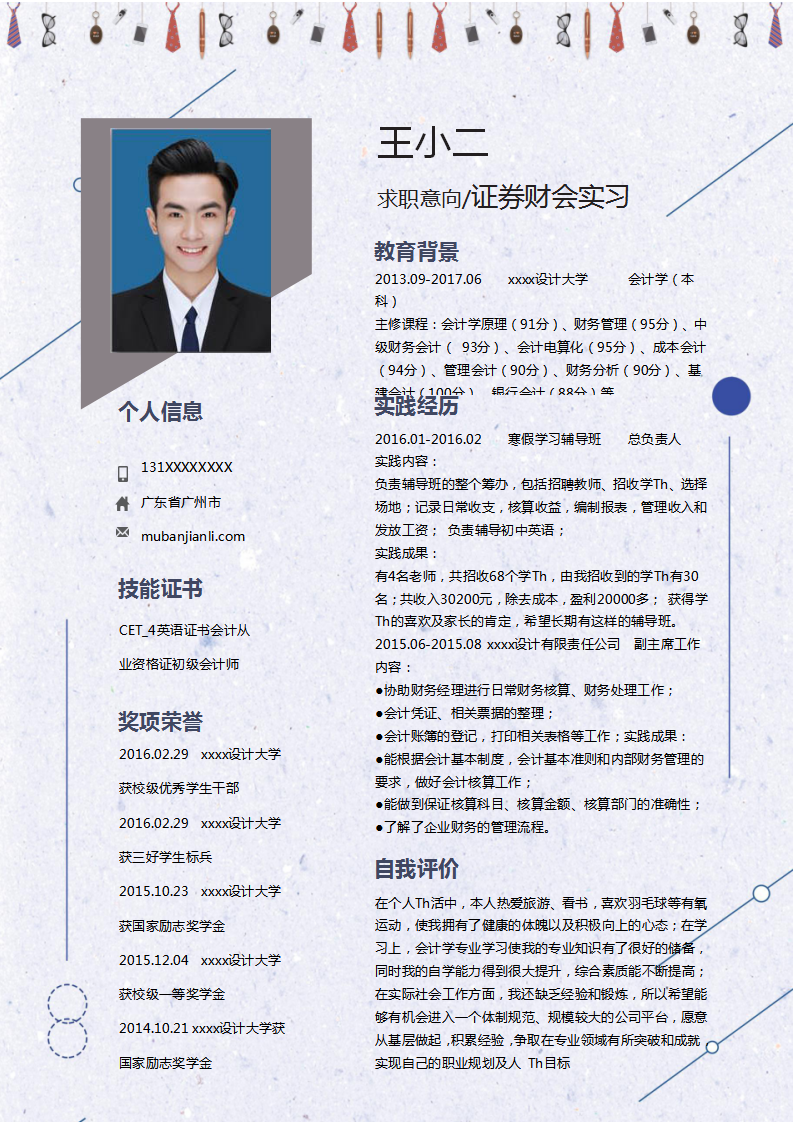 会计实习生个人简历模板 声明:本站所有模板均为:word格式简历模板,遇到问题联系客服微信:ivx168 ;【付费模板购买后F5刷新一下】 收藏 海报 分享链接:https://www.mubanjianli.com/1595.html 分享到 :