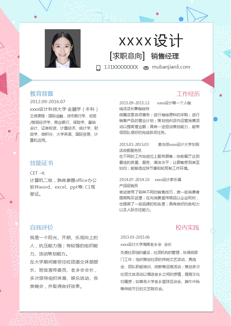 销售实习生求职简历模板 声明:本站所有模板均为:word格式简历模板,遇到问题联系客服微信:ivx168 ;【付费模板购买后F5刷新一下】 收藏 海报 分享链接:https://www.mubanjianli.com/1598.html 分享到 :