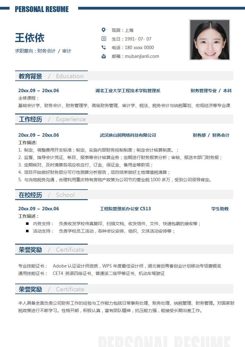 财务会计简历模板下载 声明:本站所有模板均为:word格式简历模板,遇到问题联系客服微信:ivx168 ;【付费模板购买后F5刷新一下】 收藏 海报 分享链接:https://www.mubanjianli.com/1623.html 分享到 :