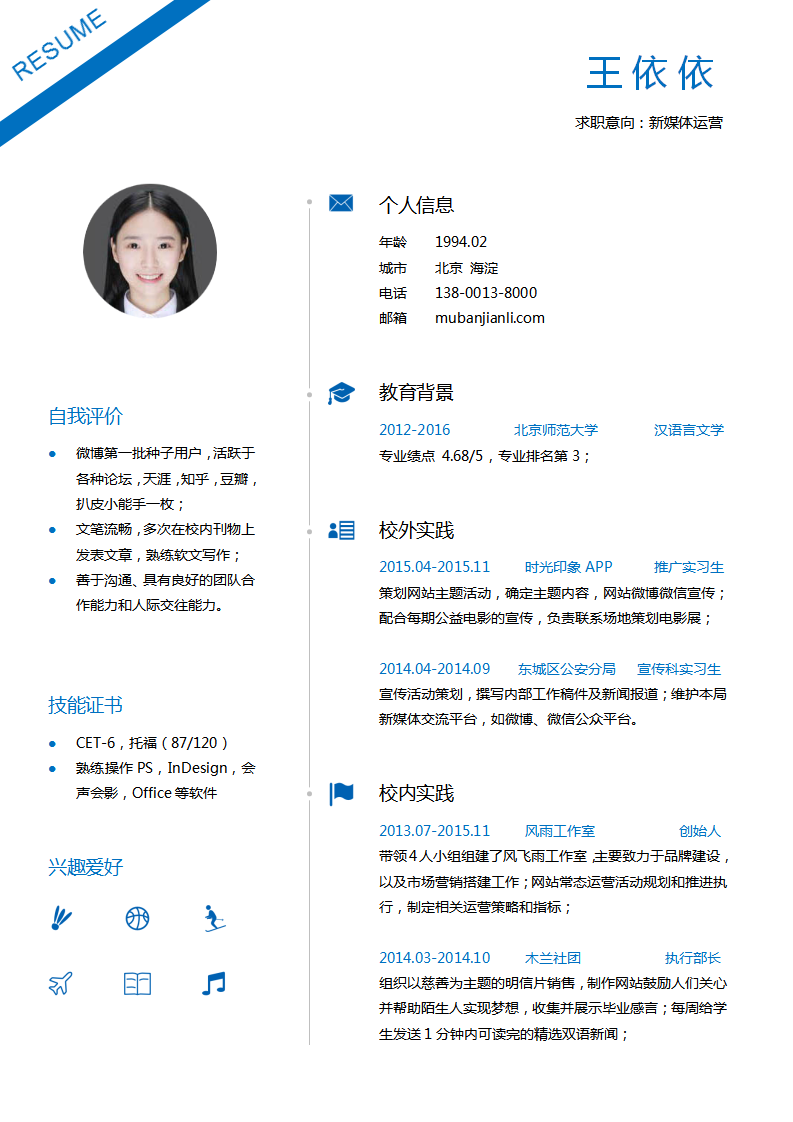 新媒体运营个人简历模板下载 声明:本站所有模板均为:word格式简历模板,遇到问题联系客服微信:ivx168 ;【付费模板购买后F5刷新一下】 收藏 海报 分享链接:https://www.mubanjianli.com/1641.html 分享到 :