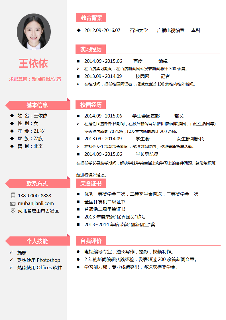 简约单页红色大学生求职简历模板下载 声明:本站所有模板均为:word格式简历模板,遇到问题联系客服微信:ivx168 ;【付费模板购买后F5刷新一下】新闻编辑红色记者 收藏 海报 分享链接:https://www.mubanjianli.com/1835.html 分享到 :
