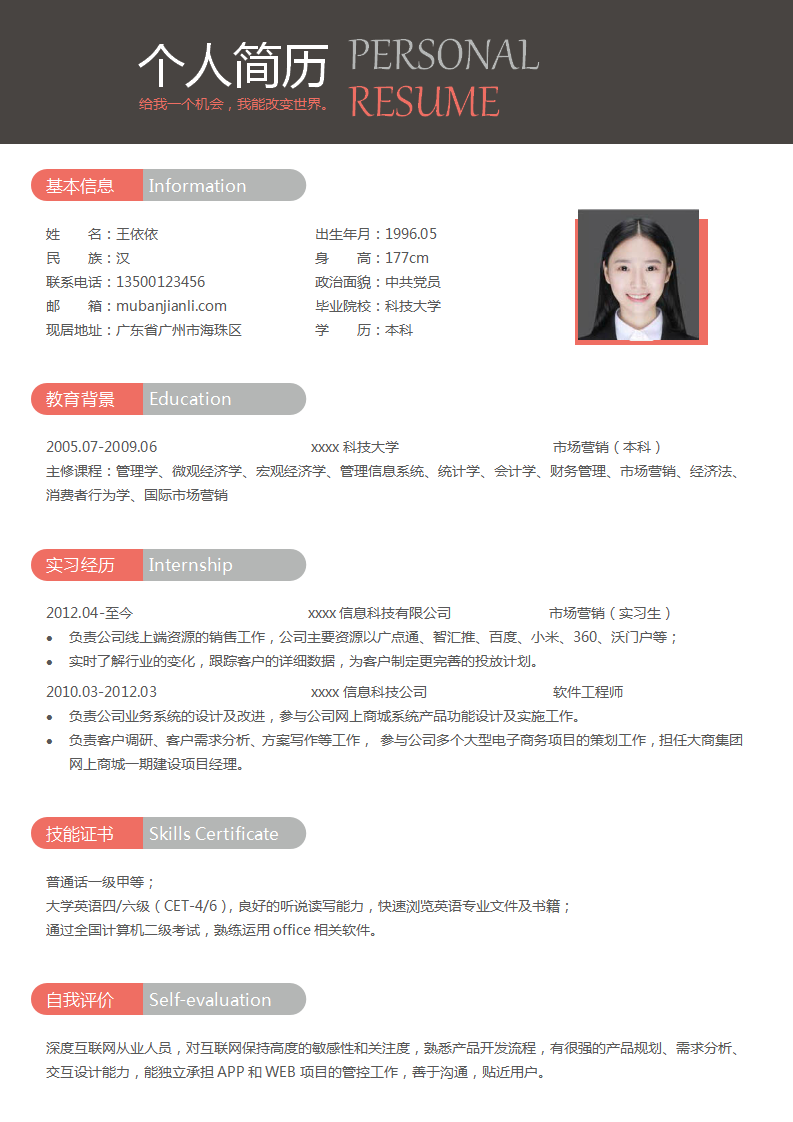 大学生找工作简历模板下载 声明:本站所有模板均为:word格式简历模板,遇到问题联系客服微信:ivx168 ;【付费模板购买后F5刷新一下】 收藏 海报 分享链接:https://www.mubanjianli.com/1961.html 分享到 :