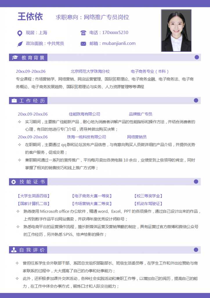 紫色大气简约大学生简历模板doc 带照片 声明:本站所有模板均为:word格式简历模板,遇到问题联系客服微信:ivx168 ;【付费模板购买后F5刷新一下】 收藏 海报 分享链接:https://www.mubanjianli.com/2109.html 分享到 :
