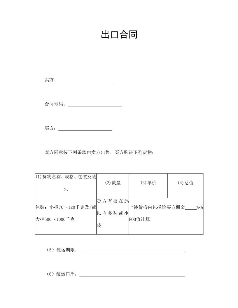 出口合同 卖方: 合同号码: 买方: 双方同意按下列条款由卖方出售,买方购进下列货物: (1)货物名称、规格、包装及唛 (2)数量 (3)单价 (4)总值 头卖 方 有 权 在 3% 以 内 多 装 或 少 装包装:小捆70~120千克及/或 大捆500~1000千克 上述价格内包括给买方佣金 %按 FOB值计算 (5)装运期限: (6)装运口岸: (7)目的口岸: (8)保险:由卖方按发票金额110%投保 (9)付款条件:买方应通过买卖双方同意的银行,开立以卖方为受益的人,不 可撤销的、可转让和可分割的、允许分批装运和转船的信用证。该信用证凭装运单 据在中国的中国银行见单即付。 该信用证必须在 前开出。信用证有效期为装船后十五天在中国到期。 (10)单据:卖方应向议付银行提供已装船清洁提单、发票,装箱单/重量单: 如果本合同按CIF条件,应再提供可转让的保险单或保险凭证。 (11)装运条件: 1)载运船只由卖方安排,允许分批装运并允许转船。 2)卖方于货物装船后,应将合同号码、品名、数量、船名、装船日期以电报通 知买方。 (12)品质和数量/重量的异议与索赔:货到目的口岸后,买方如发现货物品质 及/或数量/重量与合同规定不符,附属于保险公司及/或船公司的责任外,买方可以 凭双方同意的检验机构出具的检验证明向卖方提出异议。品质异议须于货到目的口 岸之日起30天内提出,数量/重量异议须于货到目的口岸之日起15天内提出。卖方应 于收到异议后30天内答复买方。 (13)人力不可抗拒:由于人力不可抗拒事故,使卖方不能在本合同规定期限 内交货或者不能交货,卖方不负责任。但卖方必须立即以电报通知买方。如买方提 出要求,卖方应以挂号函向买方提供由中国国际贸易促进委员会或有关机构出具的 事故的证明文件。 (14)仲裁:凡因执行本合同或与本合同有关事项所发生的一切争执,应由双 方通过友好方式协商解决。如果不能取得协议时,则在被告国家根据被告国家仲裁 机构的仲裁程序规则进行仲裁。仲裁决定是终局的,对双方具有同等的约束力,仲 裁费用除非仲裁机构另有决定外,均由败诉一方负担。 (15)备注: 卖方: (盖章) (签字) 代表人: 买方: (盖章) 代表人: (签字) 年月日订立