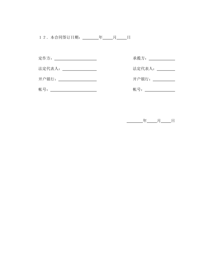承揽合同(条款) 定作方: 承揽方: (简称甲方) (简称乙方) 经双方协商一致,订立下列条款,共同信守。 品名或项 目规格、型号 单位 数量 单价 价款或酬金(元) 金额: 分仟佰拾万仟佰拾元角 1.产品的质量、包装、加工方法: 2.原材料的提供以及规格、数量、质量: 3.履行的期限、地点和方式: 4.验收标准和方法: 5.结算方式: 6.违约责任:除不可抗力的原因外,任何一方不履行合同,都要承担违约责 任。 (1)承揽方的违约责任:不能交付定作物或完不成工作,偿付不能交付定作 物或不能完成工作部分价款总值 %或酬金总额 的违约金。 (2)定作方的违约责任:中途变更定作物的数量、规格、质量和设计等,赔 偿承揽方因此造成的损失,中途解除合同,属承揽方提供原材料的,偿付未履行部 分价款总值 %的违约金;不属承揽方提供原材料的,偿付承揽方以未履行部分 酬金 %的违约金。 7.双方约定的其它条款: 8.以上条款如有未尽事宜,应以书面协议,作为附件。 9.本合同执行中发生纠纷,双方应及时协商解决,协商不成时,任何一方都 可以向合同管理机关申请调解、仲裁,也可以直接向人民法院起诉。 10.本合同一式 存查。 份,正本双方各执 份,副本送工商行政管理局所 11.本合同有效期限:从双方签署之日起到 年月日止。 12.本合同签订日期: 年月日 定作方: 法定代表人: 开户银行: 帐号: 承揽方: 法定代表人: 开户银行: 帐号: 年月日