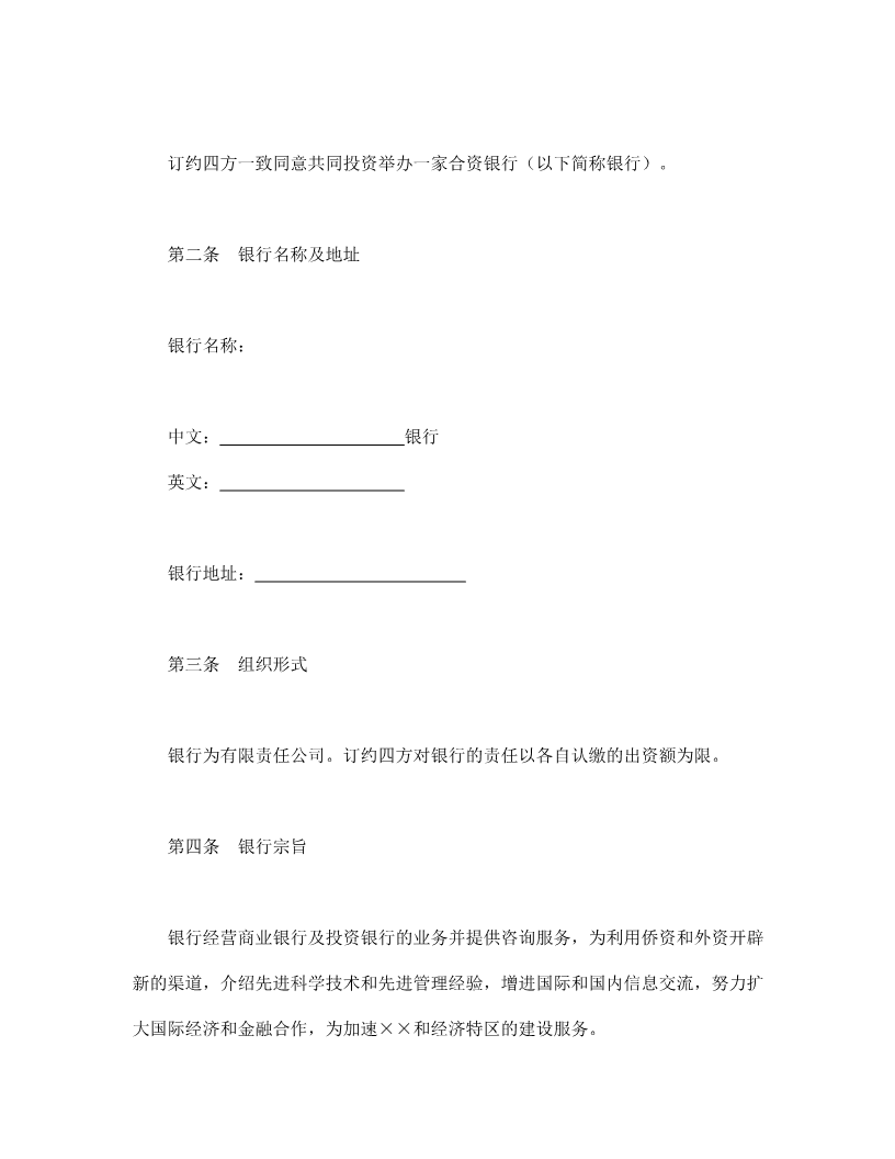 设立中外合资经营企业合同 (金融1) 目 录 1)总则 2)资本 3)出资额转让及资本更改 4)董事会 5)经营管理机构 6)业务 7)银行分支和附属机构 8)技术训练 9)确立银行设施 10)利润 11)财务会计与审计 12)税务 13)保险 14)银行职员 15)审批及注册 16)合同有效期 17)终止与清算 18)不可抗力 19)保密及其他 20)调解和仲裁 21)合同文字 22)法定通讯地址 23)附加条款 (以下简称甲方)、 (以下简称乙 (以 方)、 (以下简称丙方)合称中方和 下简称丁方),根据中华人民共和国的中外合资经营企业法(以下简称《合资法》) 和经济特区外资银行、中外合资银行管理条例(以下简称《条例》)及其他有关法 规,按照平等互利原则,通过友好协商,一致同意在中华人民共和国 共同举办一家合资银行,为此,订立本合同书。 第一章 总则 第一条 订约四方 订约四方一致同意共同投资举办一家合资银行(以下简称银行)。 第二条 银行名称及地址 银行名称: 中文: 英文: 银行 银行地址: 第三条 组织形式 银行为有限责任公司。订约四方对银行的责任以各自认缴的出资额为限。 第四条 银行宗旨 银行经营商业银行及投资银行的业务并提供咨询服务,为利用侨资和外资开辟 新的渠道,介绍先进科学技术和先进管理经验,增进国际和国内信息交流,努力扩 大国际经济和金融合作,为加速××和经济特区的建设服务。 第五条 适用法律 银行经批准成立,是中华人民共和国的法人。本合同的订立和履行应适用中华 人民共和国法律。银行的一切活动必须遵守中华人民共和国法律、法令和有关条例 规定。银行的业务活动和合法权益受中华人民共和国法律的保护。银行接受中国人 民银行和国家外汇管理局等有关机构的管理和监督。 第二章 资本 第六条 资本构成 银行的注册资本为 元。 银行第一期的实收资本为 元。订约四方出资的份额为: 元,以现金投资。 甲方占百分之 乙方占百分之 丙方占百分之 丁方占百分之 ,出资 ,出资 ,出资 ,出资 元,以现金投资。 元,以现金投资。 元。以下列方式提供投资: (1)以现金 元投资; (2)丁方将其在附属机构的直接和间接的投资转给银行,作为对银行的投资。 内包括 。 (3) 和两公司的准备金(不包括坏帐准备金) 元,应凭丁方聘请的在香港注 与尚未分配的滚存利润。 以上(2)(3)两项合计共为 册会计师验证的转入日期的资产负债表为依据,多还少补。 银行成立后,银行董事会应尽快派专门小组对 和的原放款(银行成立时已有的放款)进行审查,对银行成立前该两公司的呆帐坏帐和 银行成立后一年内发生的该两公司原放款的呆帐、坏帐均由××协助清理并负责偿 还该呆帐、坏帐引起的全部经济损失;对有坏帐风险的放款,专门小组在银行成立 一年内提出意见,转由丁方负责处理。原放款凡经专门小组审查同意转期的,其经 济责任由 和自行负责。 订约四方同意将银行历年税后利润至少提取百分之 ,经董事会决定后拨 作准备金(本合同第廿五条有进一步规定),并经董事会决定可按订约四方上述出 资比例,从该项准备金中提取,分期增加出资额至 第七条 资本提供 元。 订约四方需在银行成立后(银行的成立日期为银行营业执照的签发日期)三十 天内交足出资额,以现金投资部分应全数存入银行。丁方提供的股票等,如因技术 原因,在银行成立后三十天内未能办妥转入银行手续时,经董事长及副董事长联合 决定,可以允许再延长三十天。任何一方所应出资的现金,如逾期未交或未交足, 应按当天中国银行公布的短期放款利率支付未交部分的迟延利息。 第八条 出资凭证 订约四方缴付出资额后,应由中国注册的会计师验证,出具验资报告后,由银 行据以发给经董事长及副董事长签署的出资证明书。出资证明书载明下列事项:银 行名称,银行成立的年、月、日,订约四方名称及其出资金额,出资的年、月、日 以及发给出资证明书的年、月、日。当按照本合同第六条增加出资额后,银行将增 发出资证明书。 第三章 出资额转让及资本更改 第九条 出资额转让 订约一方如向第三者出售、转让、抵押其部分或全部出资额须经订约其他三方 同意,并经审批机构核准。订约一方转让其部分或全部出资额时,应先以书面通知 其他三方说明承让人名称及转让条件,订约其他三方有优先购买权。且其转让条件 应与向第三者转让的条件相同。如订约其他三方无意买入,出让的订约一方可按照 上述通知书的转让条件,向指定第三者进行转让。违反上述规定的,其转让无效。 第十条 注册资本更改 如注册资本需要变更时,应在指定时间内向审批机构申请批准,并向中华人民 共和国工商行政管理部门办理变更登记手续。 第四章 董事会 第十一条 董事会组成 订约四方同意在银行成立时组成董事会,董事会由十人组成。中方五人,丁方 五人,由中方和丁方各自委派。董事长由中方委派,副董事长两人由中方和丁方各 委派一人。董事长、副董事长、董事任期三年,可以连任。 第十二条 董事会权力 董事会是银行的最高权力机构,讨论决定银行的一切重大问题。其具体职权范 围在银行章程中规定。 第十三条 董事会议事规则 董事会会议应根据平等互利、友好协商及互相谅解的原则进行,对有关订约四 方权益的下列重大问题,均应由出席董事会会议的董事投票表决,一致通过, 方可作出决议。 1.银行章程的修改。 2.批准上一