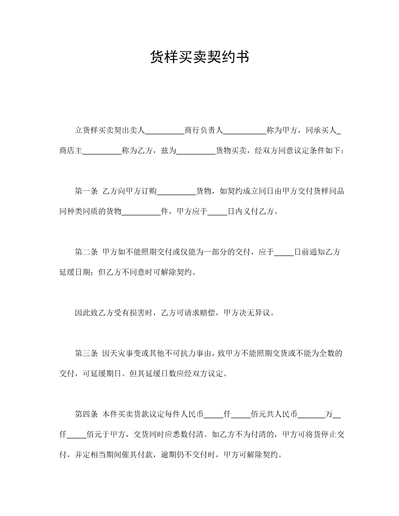 货样买卖契约书 立货样买卖契出卖人 商行负责人 称为甲方,同承买人 商店主 称为乙方,兹为 货物买卖,经双方同意议定条件如下: 第一条 乙方向甲方订购 同种类同质的货物 货物,如契约成立同日由甲方交付货样同品 件,甲方应于 日内义付乙方。 第二条 甲方如不能照期交付或仅能为一部分的交付,应于 延缓日期;但乙方不同意时可解除契约。 日前通知乙方 因此致乙方受有损害时,乙方可请求赔偿,甲方决无异议。 第三条 因天灾事变或其他不可抗力事由,致甲方不能照期交货或不能为全数的 交付,可延缓期日。但其延缓日数应经双方议定。 第四条 本件买卖货款议定每件人民币 佰元于甲方,交货同时应悉数付清。如乙方不为付清的,甲方可将货停止交 付,并定相当期间催其付款,逾期仍不交付时,甲方可解除契约。 仟佰元共人民币 万仟 因此所受的损害亦得请求赔偿。 第五条 乙方预知届期不能付款的,可于 日前通知甲方展延日期交货。倘 甲方不同意时,得为契的解除如有损害亦可请求赔偿。 第六条 甲方所交付货物,如与样品不相同时,乙方可请求更换或解除买卖契约, 甲方无异议。因此,乙方致受有损害者,更得请求赔偿。 第七条 货价如有升降变动的,各不得主张增减,或借故解除契约等情况。 本契约一式两份,甲、乙双方各执一份为凭。 卖方(甲方): 身份证号: 地址: 买方(乙方): 身份证号: 地址: 年月日