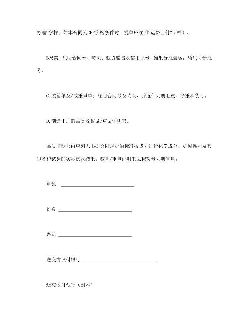 进口合同 买 方: 地 址: 电话:____________ 法定代表人:____________ 职务:________________ 国籍:____________ 卖 方: 地 址: 电话:____________ 法定代表人:____________ 职务:________________ 国籍:____________ 买卖双方在平等、互利原则上,经充分协商一致,由买方购进,卖方出售下列 货物,并按下列条款履行: 第一条 货物名称、规格、生产国别、制造工厂、包装及唛头。 每件货物上用不褪色的涂料标明货号、毛重、净重、编号、尺码、目的口岸, 并标明下列唛头 第二条 数量、单价、总值。 第三条 装运期限: 每月交货数量必须一次交清,不得分批装运。 第四条 装运口岸: 第五条 目的口岸: 第六条 付款条件:买方在收到卖方关于预计装船日期及准备装船的数量的通知 后,应于装运前20天通过________________银行开立以卖方为受益人的不可撤消的 信用证。该信用证凭即期汇款票及本合同规定的单据在开证行付款。 第七条 单据:各项单据均须使用与本合同相一致的文字,以便买方审核查对: A.填写通知目的口岸对外贸易运输公司的空白抬头、空白背书的全套已装船的 清洁提单(如本合同为FOB价格条件时,提单应注明“运费到付”或“运费按租船合同 办理”字样;如本合同为CFR价格条件时,提单应注明“运费已付”字样)。 B发票:注明合同号、唛头、载货船名及信用证号;如果分批装运,须注明分批 号。 C.装箱单及/或重量单:注明合同号及唛头,并逐件列明毛重、净重和货号。 D.制造工厂的品质及数量/重量证明书。 品质证明书内应列入根据合同规定的标准按货号进行化学成分、机械性能及其 他各种试验的实际试验结果。数量/重量证明书应按货号列明重量。 单证 份数 寄送 送交方议付银行 送交议付银行(副本) 1 空邮目的岸外运公司(副本) 2 E.按本合同规定的装运通知电报抄本。 F.按本合同规定的航行证明书(如本合同为CFR价格条件时,需要此项证明书; 如本合同为FOB价格条件时,则不需此项证明书)。 第八条 装运条件: A.离岸价条款: (a)装运本合同货物的船只,由买方或卖方运输代理人________租船公司租订 舱位。卖方负担货物的一切费用风险到货装到船面为止。 (b)卖方必须在合同规定的交货期限30天前,将合同号码、货物名称、数量、 装运口岸及预计货物运达装运口岸日期,以电报通知买方以便买方安排舱位。并同 时通知买方在装货港的船舶代理,若在规定期限内买方未接到前述通知,即作为卖 方同意在合同规定期内任何日期交货,并由买方主动租订舱位。 (c)买方应在船只受载期12天前将船名、预计受载日期、装载数量、合同号码、 船舶代理人,以电报通知卖方,卖方应联系船舶代理人配合,按期备货装船。如买 方因故需要变更船只或更改船期时,买方或船舶代理人应及时通知卖方。 (d)买方所租船只按期到达装运口岸后,如卖方不能按时备货装船,买方因而 遭受的一切损失包括空舱费、延期费及/或罚款等由卖方负担。如船只不能于船舶 代理人所确定的受载期内到达,在港口免费堆存期满后第16天起发生的仓库租费、 保险费由买方负担,但卖方仍负有载货船只到达装运口岸后立即将货物装船之义务 并负担费用及风险,前述各种损失均凭原始单据核实支付。 B.成本加运费价条款: 卖方负责将合同所列货物由装运口岸装班轮到达目的口岸,中途不得转船。货 物不得用悬挂买方不能接受的国家的旗帜的船只装运。载货船只在驶抵本合同规定 的口岸前不得停靠 或附近地区。 第九条 装运通知:卖方在货物装船后,立即将合同号、品名、件数、毛重、发 票金额、载货船名及装船日期以电报通知买方。 第十条 保险:自装船起由买方自理,但卖方应按本合同规定通知买方。如卖方 未能按此办理,买方因而遭受的一切损失全由卖方负担。 第十一条 检验和索赔:货卸目的口岸,买方有权申请 行检验。如发现货物的品质及/或数量/重量与合同或发票不符,除属于保险公司及/ 或船公司的责任外,买方有权在货卸目的口岸后90天内,根据 国商品检验局进 商品检验局出具的证明书向卖方提出索赔,因索赔所发生的一切费用(包括检验费用) 均由卖方负担。FOB价格条件时,买方有权同时索赔短重部分的运费。 第十二条 不可抗力:由于人力不可抗拒事故,使卖方不能在合同规定期限内交 货或者不能交货,卖方不负责任。但卖方必须立即以电报通知买方,并以挂号函向 买方提出有关政府机关或者商会所出具的证明,以证明事故的存在。由于人力不可 抗拒事故致使交货延期一个月以上时,买方有权撤消合同,卖方不能取得出口许可 证,不得作为不可抗力。 第十三条 延期交货及罚款:除不可抗拒原因外,如卖方不能如期交货,买方有 权撤销该部分的合同,或经买方同意在卖方缴纳罚款的条件下延期交货。买方可同 意给予卖方15天的优惠期。罚款率为每10天按货款总额的1%。不足10天者按10天计 算。罚款自第16天起计算,最多不超过延期货款总额的5%。 第十四条 仲裁:一切因执行本合同或与本合同有关的争执,应由双方通过友好 方式协商解决。如经协商不能得到解决时,应提交中国国际经济贸易仲裁委员会, 按照该仲裁委员会仲裁程序进行仲裁。仲裁委员会的裁决为终局裁决。对双方均有 约束力,仲裁费用除仲裁委员会另有决定外,由败诉一方负担。 第十五条 本合同于 年____月____日于____国 市用____文签 署,正本一
