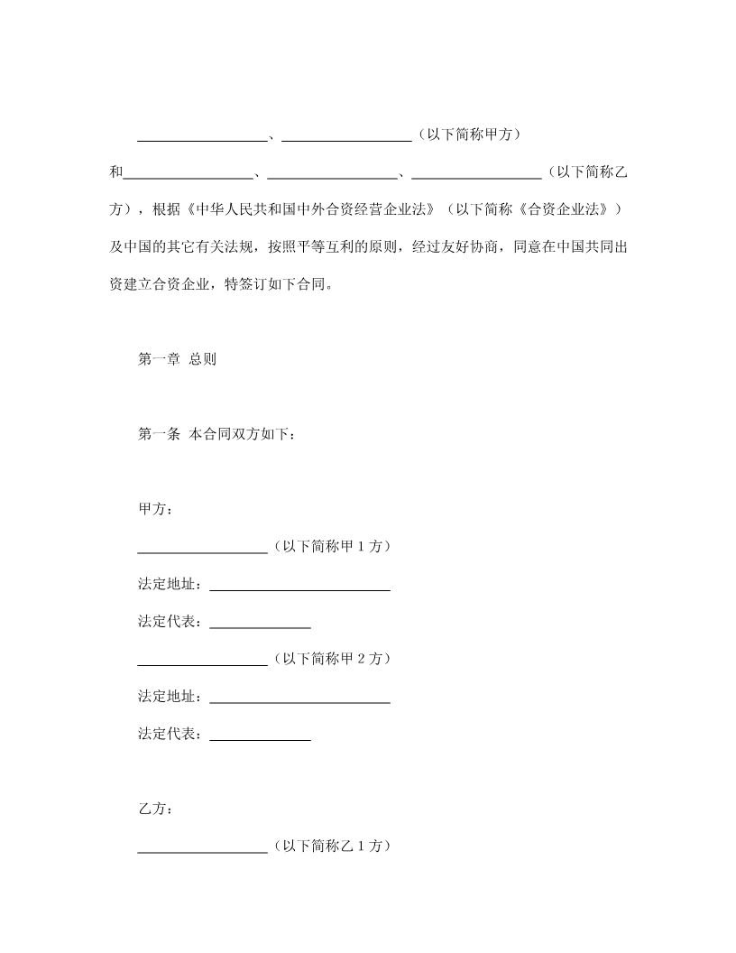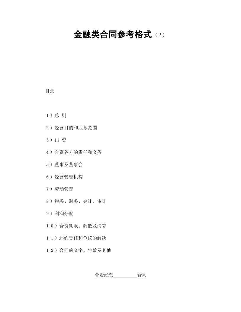 金融类合同参考格式(2) 目录 1)总 则 2)经营目的和业务范围 3)出 资 4)合资各方的责任和义务 5)董事及董事会 6)经营管理机构 7)劳动管理 8)税务、财务、会计、审计 9)利润分配 10)合资期限、解散及清算 11)违约责任和争议的解决 12)合同的文字、生效及其他 合资经营 合同 和、(以下简称甲方) 、、(以下简称乙 方),根据《中华人民共和国中外合资经营企业法》(以下简称《合资企业法》) 及中国的其它有关法规,按照平等互利的原则,经过友好协商,同意在中国共同出 资建立合资企业,特签订如下合同。 第一章 总则 第一条 本合同双方如下: 甲方: (以下简称甲1方) 法定地址: 法定代表: (以下简称甲2方) 法定地址: 法定代表: 乙方: (以下简称乙1方) 法定地址: 法定代表: (以下简称乙2方) (以下简称乙3方) 法定地址: 法定代表: 法定地址: 法定代表: 第二条 甲1方、甲2方对于本合同规定的关于甲方所应履行的全部条款,负有 连带责任和共同义务;乙1方、乙2方、乙3方对于本合同规定的关于乙方所应履 行的全部条款,负有连带责任和共同义务。 第三条 合资企业的名称为 ,英文名称为 (以下称“合资公司”)。 法定地址: 第四条 合资公司为中国的法人,遵守中国的法律、法规以及有关条例、规定并 受其管辖和保护。 第五条 合资公司为有限责任公司。合资各方对合资公司的责任以各自认缴的出 资额为限。按照各自在注册资本中的出资比例分享利润和分担风险及亏损。 第六条 根据董事会的决定,合资公司经政府有关部门批准后,可以在中国国内、 外设立分支机构。 第二章 经营目的和业务范围 第七条 合资公司的经营目的是:用科学的经营管理方法,为国内、外用户提供 租赁服务,协助国内企业的技术改造和设备更新,支持国内用户的出口创汇和机器、 设备的出口租赁,促进中国和××以及其他国家、地区之间的经济交流和技术合作。 第八条 合资公司的业务范围如下: 1.根据中华人民共和国国内、外用户的需要,经营国内、外生产的各种先进 适用的机械、电器、设备、交通运输工具以及各种仪器仪表、电子计算机等以及先 进技术的租赁、转租赁、租借和对租赁资产的销售处理。 2.直接从国内、外购买经营前述租赁业务所需要的技术租赁物。 3.租赁业务的介绍、担保和咨询。 第三章 出资 第九条 1.合资公司的投资总额和注册资本均为 元。甲、乙双方的出资 比例各为 %,出资金额各为 元。 2.合资各方出资比例和以现金支付的金额如下: 甲1方: 支付。 %%元,其中 元,其中 元以与其等值的人民币 元以与其等值的人民币 甲2方: 支付。 乙1方: 乙2方: 乙3方: %%%元元元 3.在合资公司领到营业执照后 个工作日内,合资各方应将上述各自 认缴的出资额全部汇入合资公司在中国银行的帐户。 4.以人民币出资时,人民币与美元的换算率,应以缴付日当日的中国国家外 汇管理局公布的外汇牌价为准。 5.在合资期间,合资公司不能减少注册资本。 6.合资各方缴付出资额后,应由在中国注册的会计师验证并出具验资报告, 由合资公司据以发给出资证明书。 7.合资期间内,合资的任何一方,不得将合资公司发给的出资证明书转让、 抵押,或作为第三者对合资公司拥有债权的目的物。 第十条 1.合资公司注册资本的增加、转让或以其他方式时处置,应由董事会会议通 过,报原审批机关批准,然后到原登记管理机构办理变更登记手续。 2.合资各方的任何一方,如将出资额的全部或一部分进行转让时,其他的合 资方有优先购买权。合资方的任何一方向第三者转让出资额的条件,不得优惠于向 其他合资方转让时的条件,本款中的合资各方为甲1方、甲2方、乙1方、乙2方、 乙3方。 3.在甲、乙双方的出资比例保持相等的条件下,甲、乙各方的出资额可以在 各自部相互转让。 第四章 合资各方的责任和义务 第十一条 合资各方发挥各自具有的特点和长处,为支持合资公司的建立和业务 开展,承担下述责任和义务: 1.甲方的责任 (1)负责为建立合资公司向中国政府有关部门办理报批,领取批准证书和营 业执照等有关手续。 (2)协助租借办公用房和购买办公用品。 (3)介绍和推荐租赁用户和项目。 (4)提供国内金融和租赁市场信息。 (5)协助合资公司在中国国内成立分支机构。 (6)向合资公司推荐优秀的经营管理人员及其他人员。 (7)协助为合资公司中的外籍人员办理入境签证、长期居留证、旅行证等手 续。 (8)协助筹措外汇及人民币资金。 2.乙方的责任 (1)利用在 及世界各国的营业网,宣传合资公司的租赁业务, 向合资公司介绍和推荐租赁用户和项目。 (2)介绍和推荐世界各国生产的技术先进、价格合理的租赁物件。 (3)协助合资公司向国外出租设备、以及承租人产品的出口。 (4)提供国际金融市场、租赁业务的信息以及开展租赁业务所需的各种合同 文本。 (5)协助对国外用户进行资信调查。 (6)在合资公司所在地或 对公司职员进行业务培训。 (7)协助合资公司使用注册资本在外国购买交通工具、通讯设备及办公用具。 (8)协助合资公司以优惠条件在国外筹措资金。 第五章 董事及董事会 第十二条 董事的派出 1.合资公司的董事共 名,其中甲方派出 名,乙方派出 名。 2.董事的任期为 年,可连任。董事的替换或缺员补充,要由原派遣 方面以书面形式通知董事会,该董事的任期以前任者的任期剩余期间为限。