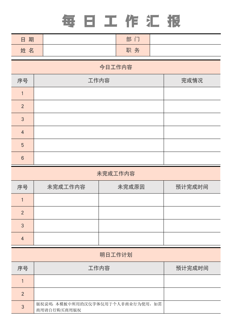 每 日 工 作 汇 报 日 期 姓 名 部 门 职 务 今日工作内容 工作内容 完成情况 序号 123456未完成工作内容 未完成工作内容 未完成原因 预计完成时间 序号 1234明日工作计划 工作内容 预计完成时间 序号 123版权说明:本模板中所用的汉仪字体仅用于个人非商业行为使用,如需 商用请自行购买商用版权