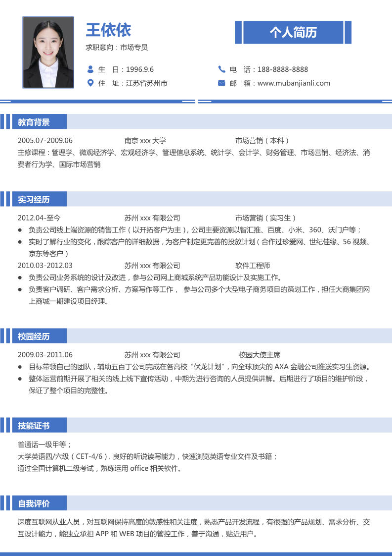 单页市场专员求职简历模板 声明:本站所有模板均为:word格式简历模板,遇到问题联系客服微信:ivx168 ;【付费模板购买后F5刷新一下】单页蓝色 收藏 海报 分享链接:https://www.mubanjianli.com/44208.html 分享到 :